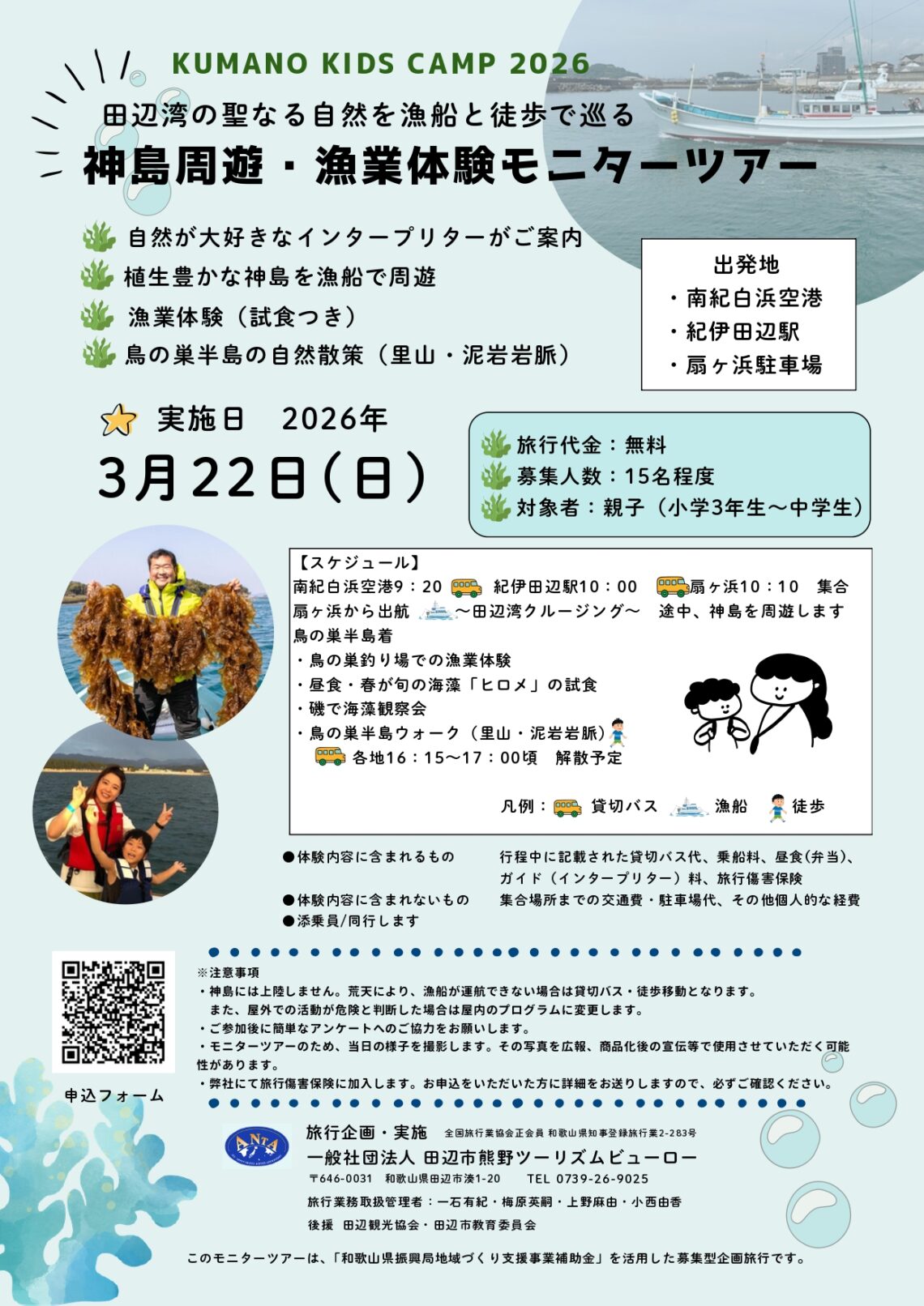 本ツアーは、商品化に向けたモニターツアーとして、「和歌山県振興局地域づくり支援事業補助金」を活用し、田辺市熊野ツーリズムビューローが実施する募集型企画旅行です。