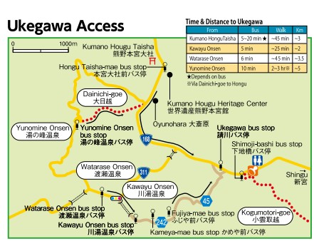 The Kumano Gobo Nankai Bus #53 departing from Hongu Taisha-mae bus stop visits all three of the Hongu area onsen hot spring communities (Yunomine Onsen, Wataze Onsen, Kawayu Onsen) on its way to Ukegawa, the Traditional Boat Tour center, and eventually Shingu. It is usually full during peak season, and visitors sometimes are unable to board at their bus stop.