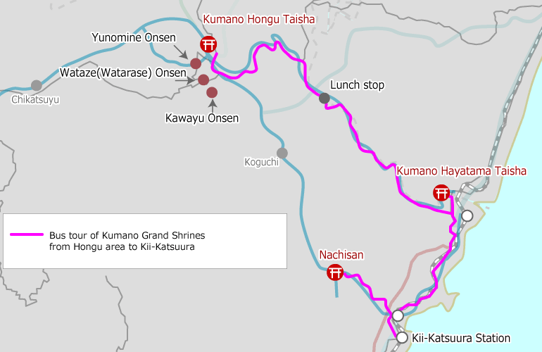 This bus does a tour of the three Kumano Grand Shrines: Kumano Hongu Taisha, Kumano Hayatama Taisha, and Kumano Nachi Taisha, arriving at the Kii-Katsuura station.