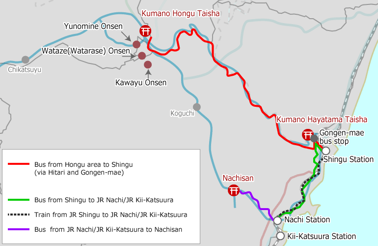 It does pick-ups in Kawayu Onsen, Wataze/Watarase Onsen, and Yunomine Onsen. There are no pick-ups in Hongu village.