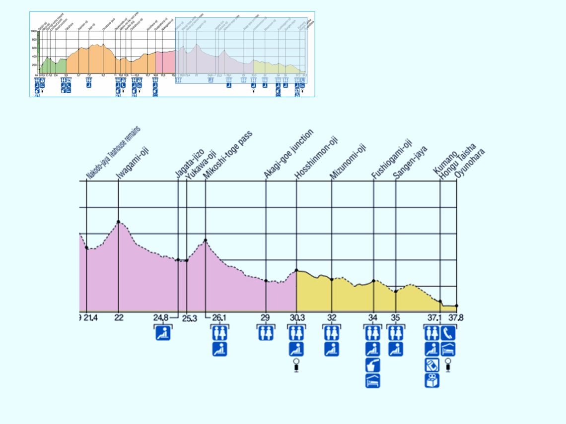There is no water source until travelers reach the vending machines at Hosshinmon-oji, so bringing enough water at the start is essential. Also, there are no toilets until Hosshinmon-oji.